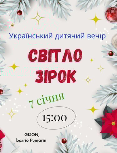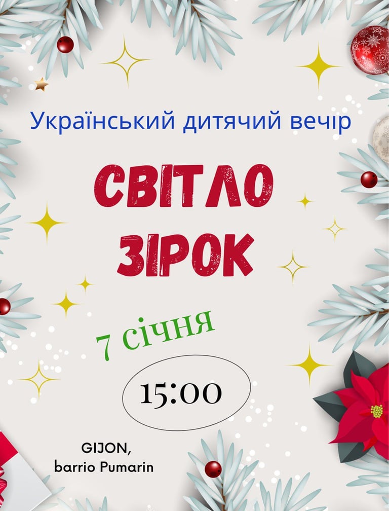 El 7 de enero de 2026, en el Ayuntamiento de Pumarín Gijón Sur, tuvo lugar un acto infantil ucraniano dedicado a las tradiciones culturales del Año Nuevo y la Navidad en Ucrania. El evento reunió a niños y familias en un ambiente festivo y educativo, con el objetivo de preservar y compartir las tradiciones ucranianas, fortaleciendo los lazos culturales dentro de nuestra comunidad. La celebración contó con el apoyo de los patrocinadores Hali-hop y KLR Bus, cuya colaboración hizo posible la realización de esta iniciativa. Expresamos nuestro sincero agradecimiento al Ayuntamiento de Pumarín Gijón Sur por la cesión del espacio y por su continuo apoyo a las actividades culturales de la comunidad ucraniana en Gijón.
