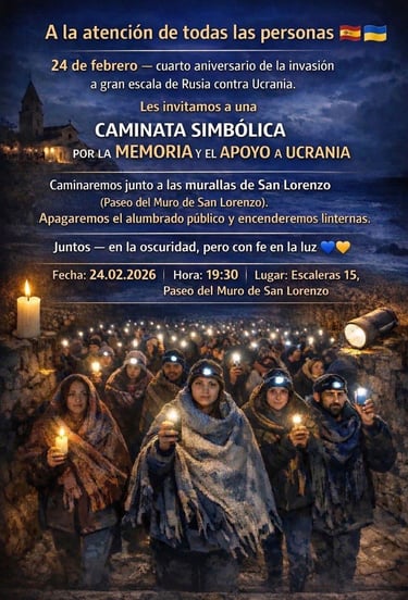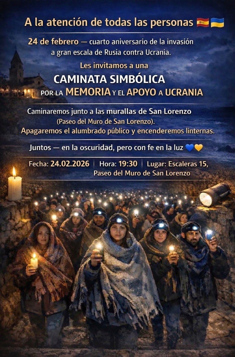 Con motivo del cuarto aniversario de la invasión a gran escala de Federación de Rusia contra Ucrania, el 24 de febrero nos reuniremos a las 19:30 en el Paseo de San Lorenzo, junto a las 15 escaleras. A las 20:00 iniciaremos una caminata por el paseo marítimo con linternas encendidas y mantas, como símbolo del frío y la oscuridad que vive Ucrania tras la destrucción sistemática de su infraestructura energética. El recorrido finalizará en la Plaza Mayor de Gijon. Nos reunimos para recordar a las víctimas, acompañar al pueblo ucraniano y reafirmar nuestro compromiso con la paz, la justicia y la libertad. La luz que llevamos en nuestras manos representa la solidaridad y la esperanza que ninguna agresión puede apagar. Gijón no es indiferente. Les esperamos.